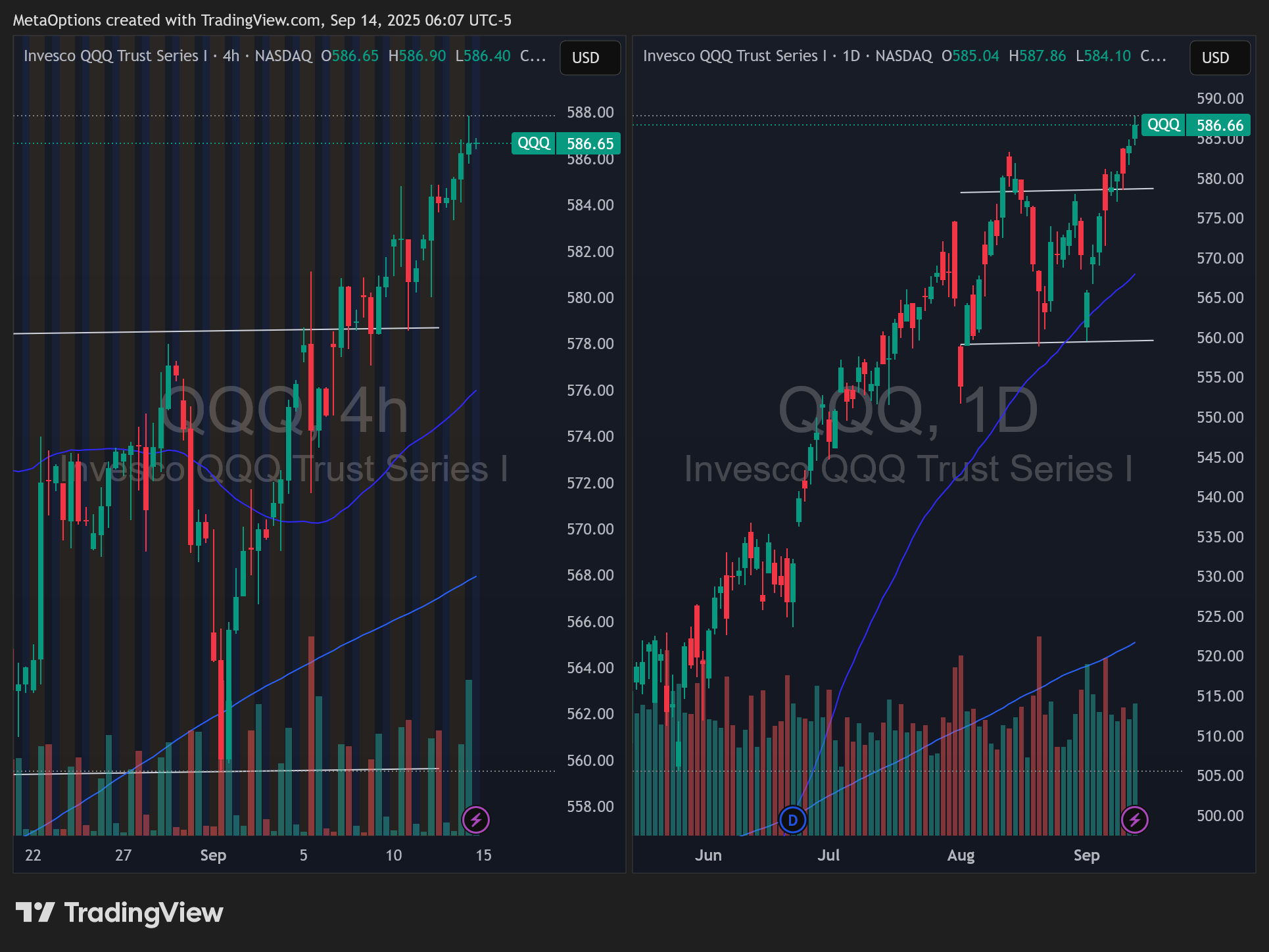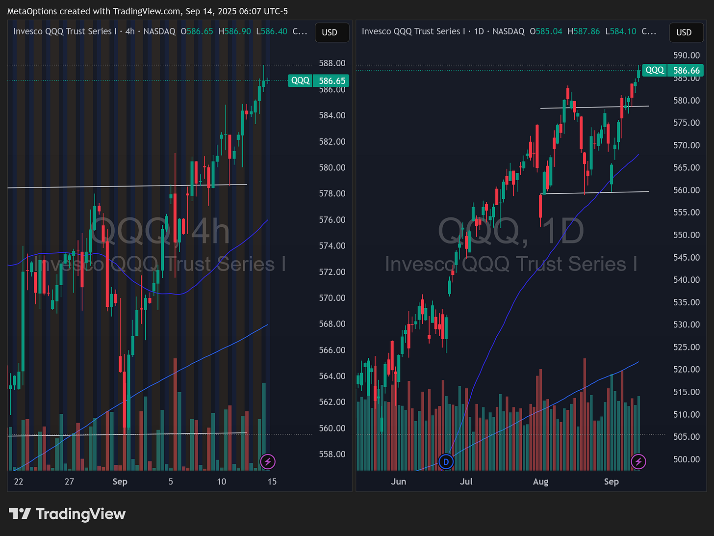QQQ: 580 as pivot. 586 to 588 as the breakout zone. 590 to 600 is the upside target.