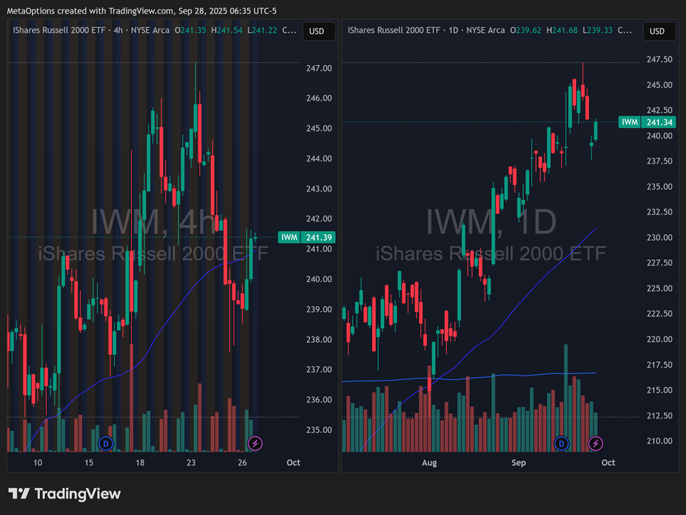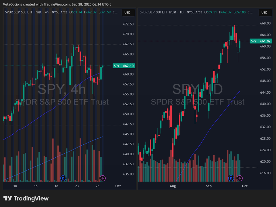From last week’s Macroview, the playbook held perfectly, which saved us from a ton of losses! We said SPY needed to stay above 6550 and QQQ momentum would extend as long as 580 held. That is what happened. SPY respected the shelf and pushed into the 660s. QQQ held above 590 and stayed bid. Small caps retested 236 early in the week, then regained ground to finish just under 241. Breadth remained constructive. Sentiment stayed neutral, meaning the advance was not driven by froth.