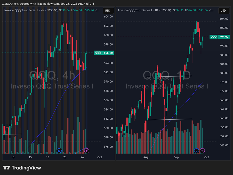 Labor is the swing factor. A cooler jobs print with tame Average Hourly Earnings supports lower yields and multiple expansion. Hot wages would pressure duration and make 600 on QQQ tougher near term.