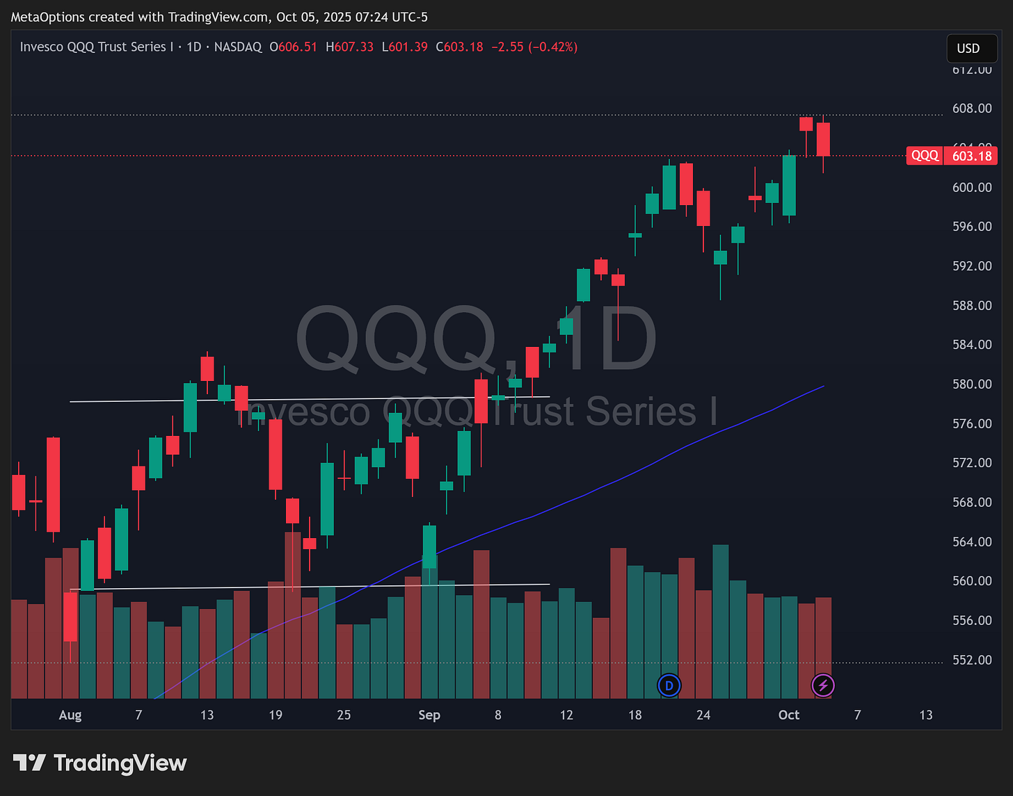Structure remains bullish. The 598 to 600 base held and 602 to 606 is the continuation trigger cluster. Through 606 opens 610 to 612. If momentum fades, expect a quick tag of 600 then 596. Bigger line in the sand remains 590. The 50 day near 579 is rising and backs the trend. Daily RSI near the high 60s with ADX in the 20s keeps leadership with tech.