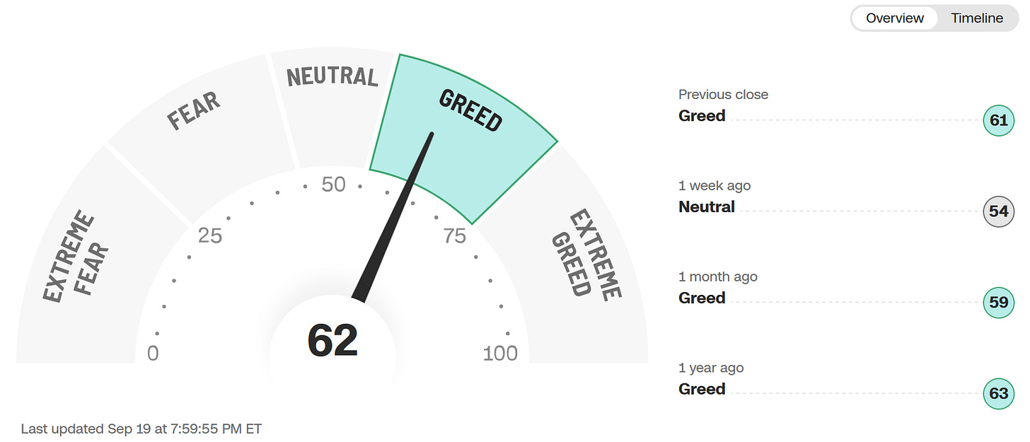 The gauge ticked up to 62 (Greed) from Neutral a week ago. Translation: tailwind, but less room for sloppy entries. Chasing into round numbers (SPY 6️⃣6️⃣5️⃣ / QQQ 6️⃣0️⃣0️⃣) is where traders donate. Let price come to your levels.