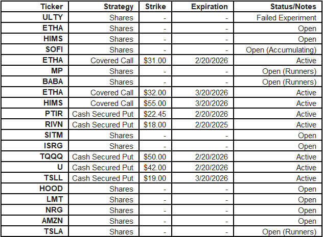 We are currently managing a diverse mix of Covered Calls (income generation) and Cash Secured Puts (bullish entry targets).