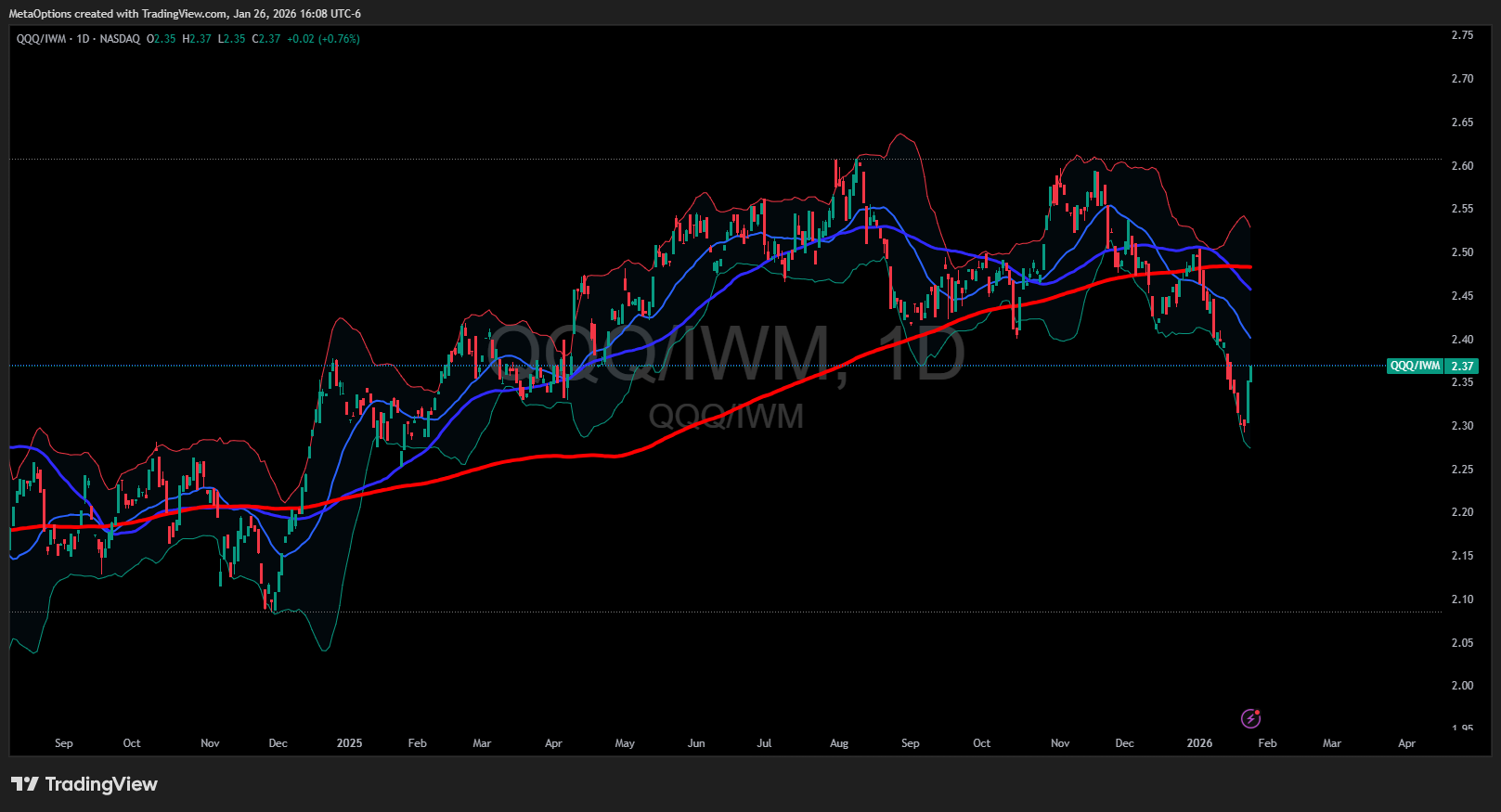 The Broadening (QQQ/IWM): On a positive note, the QQQ/IWM ratio is falling to ~2.37. Small caps (IWM) are outperforming Tech, suggesting the rally is broadening, even if it is tilting defensive.